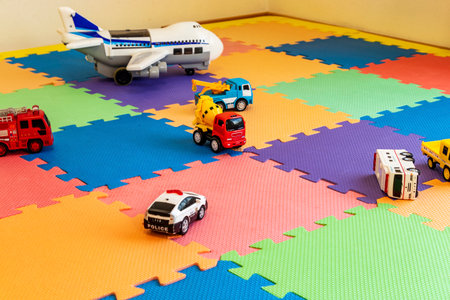 Toy cars on colorful mats