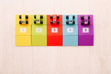 Educational toys for kids. Colorful wooden cars with numbers on floor background