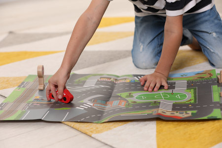 Little boy playing with set of wooden road signs and cars indoors, closeup. Child's toy