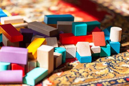 Playing colorful wooden cubes on carpet, sun