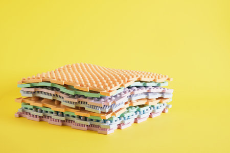 Massage floor mat, orthopedic, for stepping on feet, children's, cheerful multicolored pattern,yellow background copy space