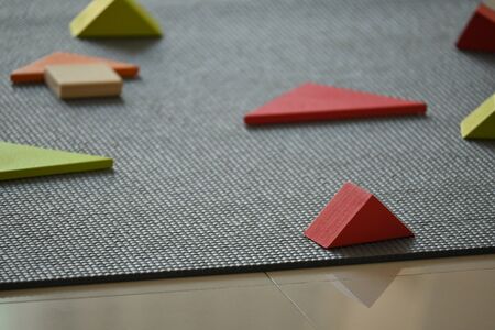 Hands of a child assemble a color puzzle with details of different geometric shapes on the table. Leisure of the child in confinement