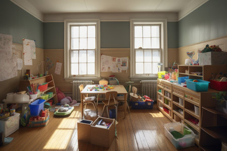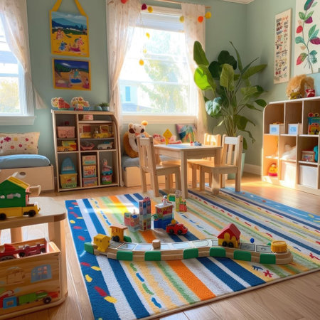 Kids' playroom with wooden toys, picture books, and cheerful wall decor in natural light