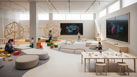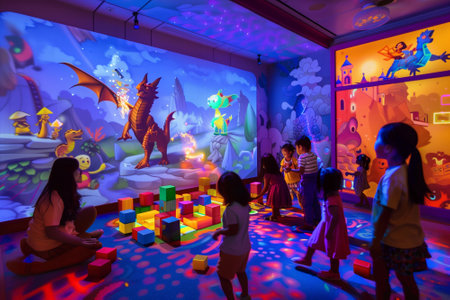 Children engage in creative play within a spacious, bright playroom featuring interactive digital displays and abstract art installations. The interior design incorporates neutral tones, with pops of color from toys and building blocks. Overhead lighting illuminates the scene, suggesting a modern, clean environment suitable for educational or promotional projects.