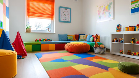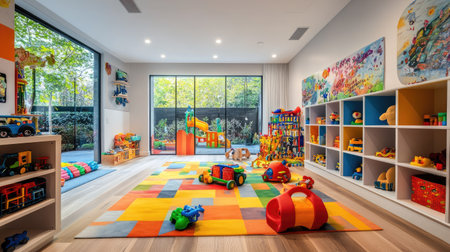 A cheerful playroom filled with colorful toys and soft mats, bathed in natural light. This strategic arrangement fosters creativity, imagination, and joyful exploration for children.