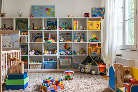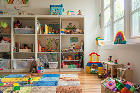 Organized child's playroom with toys, books, and play area for creative and educational fun