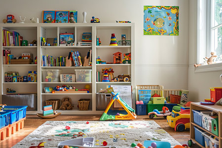 Tidy and organized kids playroom with diverse toys, storybooks, and a designated play space