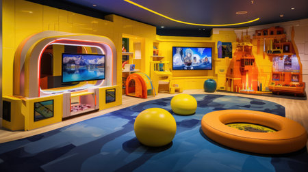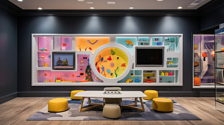 Vibrant children's playroom in upscale community center with modern design and ample natural light