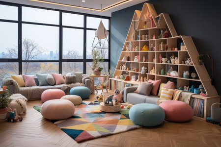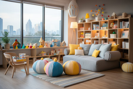Colorful playroom with modern design, comfortable sofa, and educational toys generated by artificial intelligence