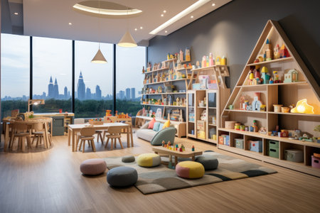 Tidy and well-arranged childrens playroom with various toys, books, and dedicated play space