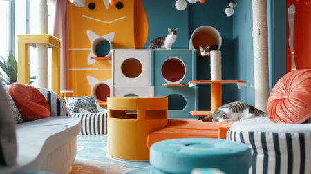 A chic and modern cat condo with interactive elements, set in a vibrant play area with various cat toys and climbing structures