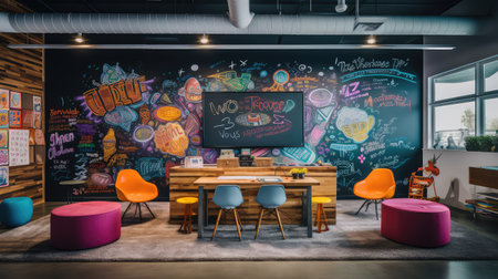 Discover a modern workspace showcasing vibrant wall art, comfortable seating, and an inviting atmosphere, perfect for collaboration and creativity in a professional environment.