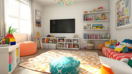 Spacious family room showcases a modular corner TV unit surrounded by vibrant decor. Cozy seating and playful elements invite family gatherings and entertainment.