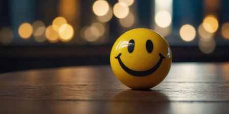 A yellow rubber ball with a smiley face on it sits on a wooden table. Concept of happiness and positivity, as the smiley face on the ball suggests a cheerful and friendly atmosphere