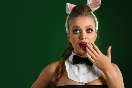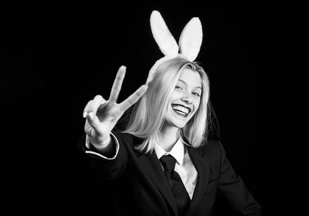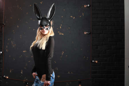 Sexy model dressed in costume Easter bunny. Egg hunt. Sexy woman with mask Easter bunny on a black background and looks very sensually. Easter dinner menu. Blonde woman in rabbit bunny ears.