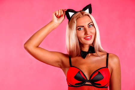 Sexy blonde with kitten ears over red background