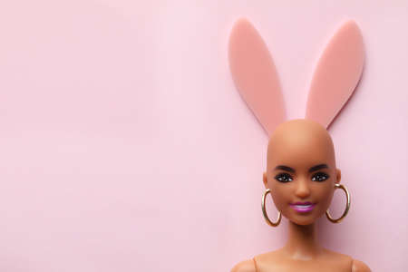 Doll head with bunny ears on pink background. Mock-up.