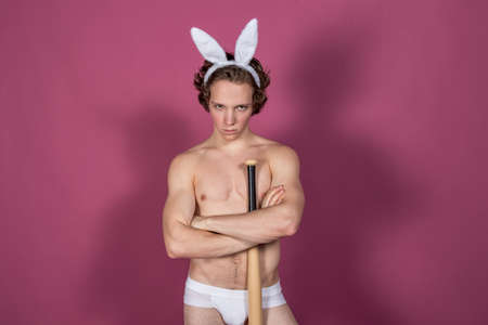 Funny naked guy wearing bunny ears with baseball bat over pink background