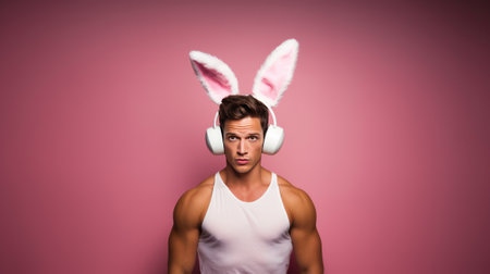 Muscular man in a tank top sporting, confident male with fluffy bunny ears and white headphones on pink background. Fun Home Entertainment and Easter Celebration.