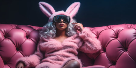 Gorgeous girl in bunny costume holding long ears Studio shot of young woman dancing in rabbit kigurumi : Generative AI