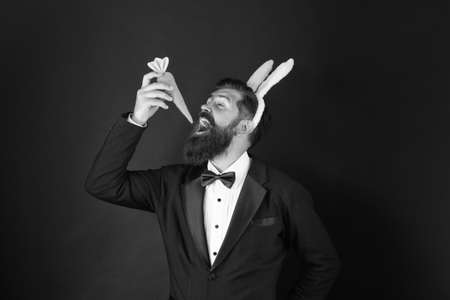 I am hungry bunny. Celebration Easter holiday. Easter day. Event host. Celebrate Easter. Bearded man with long ears. Elegant businessman with long ears. Handsome man wear bunny costume accessory