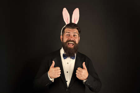 Easter day. Event host. Celebrate Easter. Let me be your bunny. Celebration Easter holiday. Bearded man with long ears. Businessman with long ears. Handsome man wear bunny costume accessory