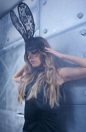 Young woman in black rabbit or hare fancy mask and black dress. Blonde female with long hair and closed eyes and hands on head. Female on smoke and metal wall background.