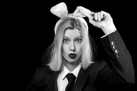Sexy blond model dressed in Easter bunny costume stands on a white background and sensually posing. Halloween and Easter funny costume - Image. Hot girl. Black and white photo.