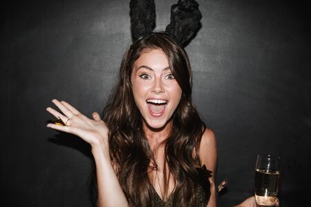Image of young delighted woman in bunny ears holding glass of champagne while smiling isolated over black wall