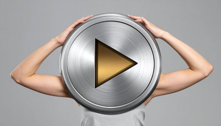 A person holds a large metallic play button with a brushed silver surface and golden triangle over their head.