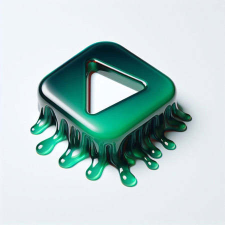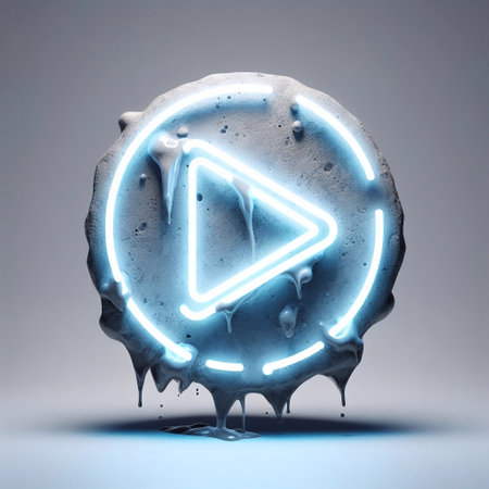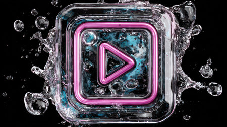 An artistic rendering features a play button icon encased in transparent material and splashed with water droplets. The neon-pink button stands out against a textured backdrop of teal and black. The composition utilizes dramatic lighting and a splash effect, potentially suitable for digital content or abstract design purposes.