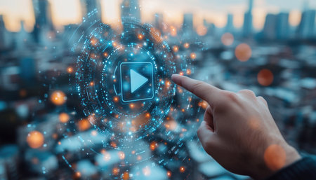 Finger about to press a play button on a home sound system interface. Black background and blue light. Composite between a photography and a 3D background. Horizontal image