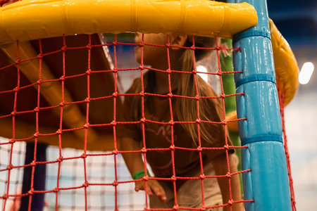 A little girl happily explores a colorful playground, holding on to a red safety net and moving around the play area in an amusement park. A child climbs through a maze in a playroom.