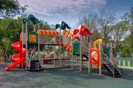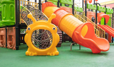 Colorful children playground park. Children's slides and playground made of plastic material