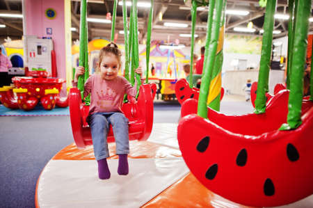 Cute baby girl swinging on swings in indoor play center.