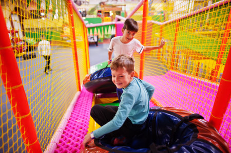 Happy two brothers in tubing donuts enjoying slides in fun children center.