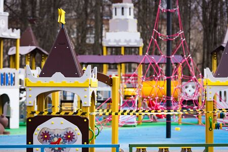 the playground is covered with a signal tape epidemic coronovirus COVID19. all small children are quarantined at home