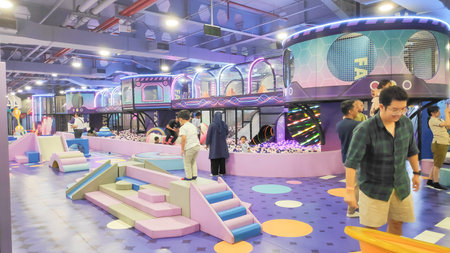 Photo of kids and parents enjoying the vibrant indoor amusement park featuring a large swing ride in a mall. Bandung 10 May 2025