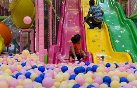 Kids engage in fun activities, sliding down vibrant slides surrounded by ball pit on a lively day.
