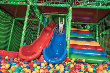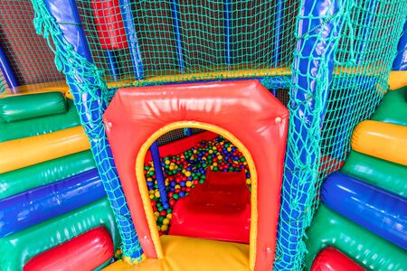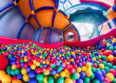 children's playroom with colorful balls and a slide made of plastic. . Wide panorama.