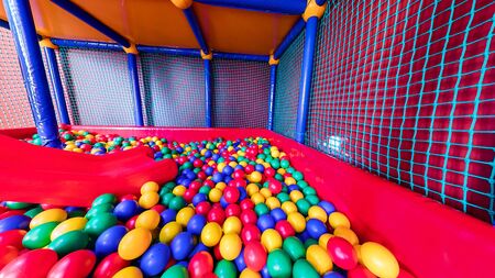 Colored plastic balls in pool of game room. Swimming pool for fun and jumping in colored plastic balls