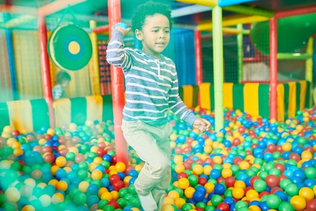 3 year old boy is sitting at the slide hole. Danger. Indoors shot.