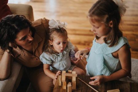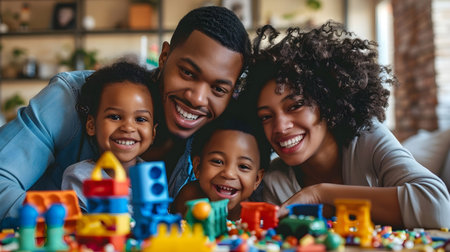 A happy family of four plays with colorful building blocks on a rug in their sunny living room. The parents and two young children share a moment of joy and bonding in a cozy home environment.