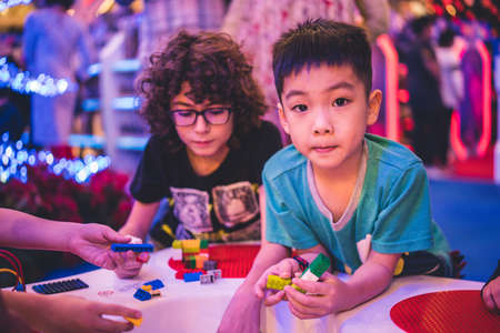 Kuala Lumpur, Malaysia – December, 2019: Children play with Lego blocks at Pavilion Shopping Mall in Bukit Bintang.