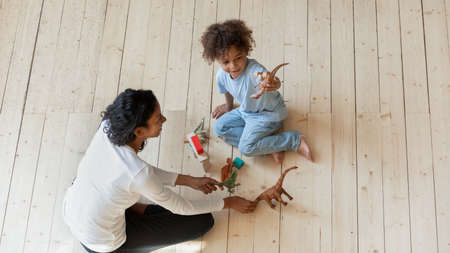 Top view of loving african American mom sit on wooden warm floor at home play with little ethnic son, playful biracial mother and small boy child have fun involved in game with animal toys together