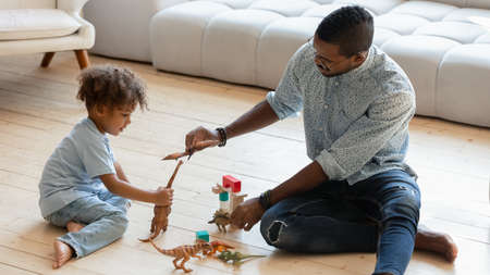 Loving african American young father sit on warm wooden floor play toys bricks cubes with small toddler son, playful biracial dad have fun involved in funny game activity with little boy child at home