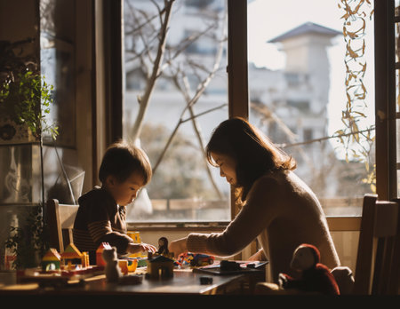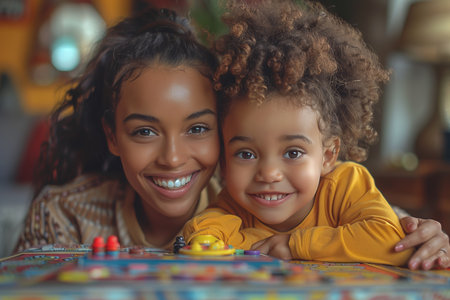Mother and child bond joyfully at the table, engaging in interactive board game activities
