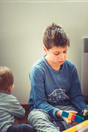 Adorable baby boy is sitting on the floor and playing with his older brother