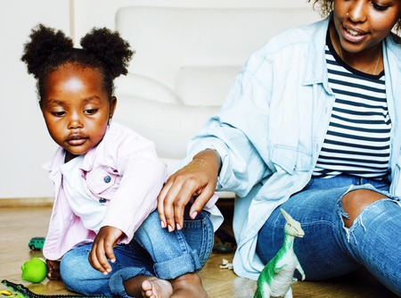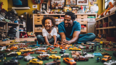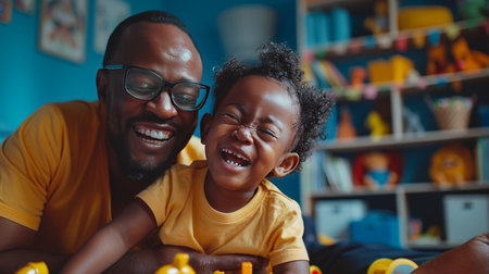 Generative AI : Happy young african american man father with little son having fun and playing together with toys while lying on floor at home dark skinned family dad and kid makin