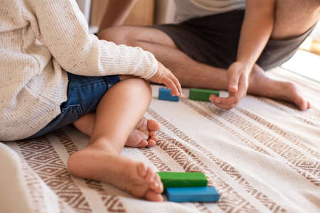 Little kid and his father playing at home with wood building blocks. Homeschooling. Stay at home. Family time